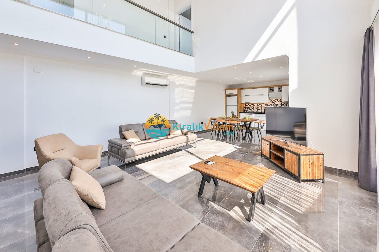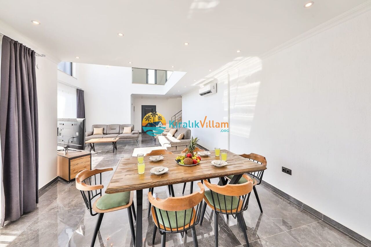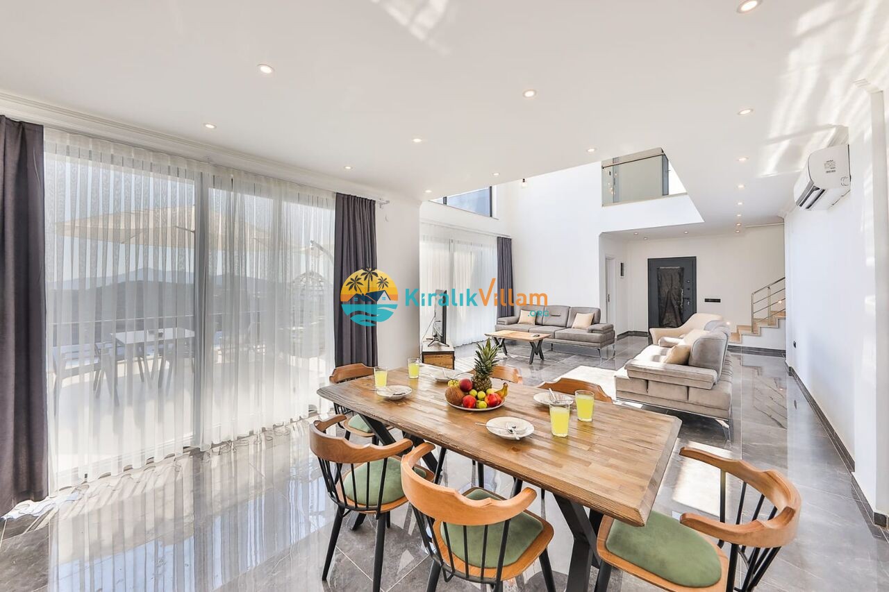 Modern oturma grubu, televizyon, klima, orta sehpa, uydu alıcısı, yemek masası, sandalyeler ve havuz terasına çıkış bulunmaktadır.