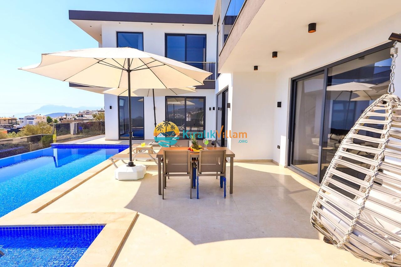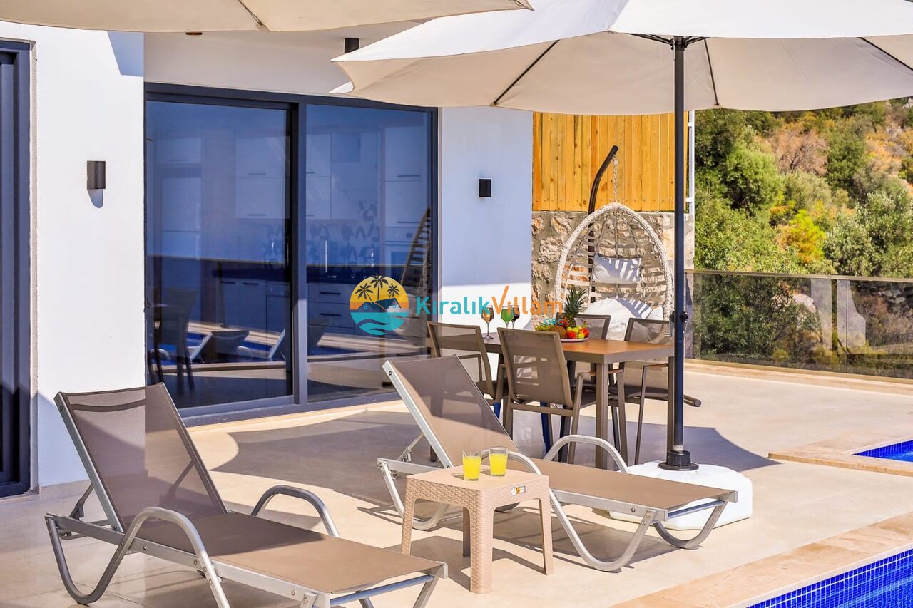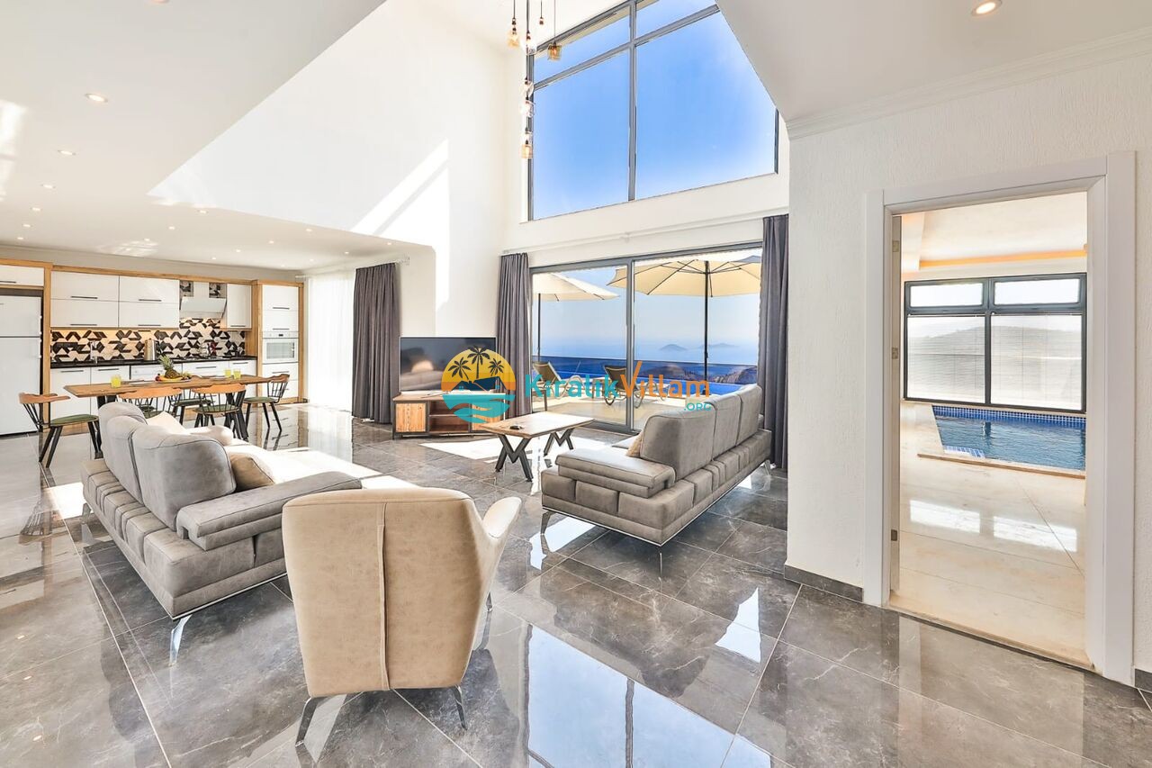 Modern oturma grubu, televizyon, klima, orta sehpa, uydu alıcısı, yemek masası, sandalyeler ve havuz terasına çıkış bulunmaktadır.